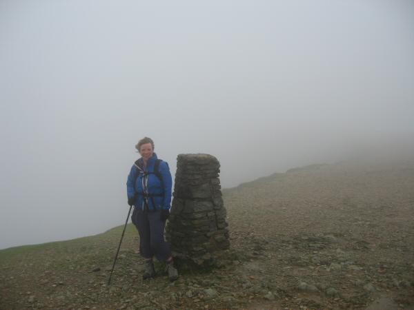 Anne at the trig point on Helvellyn's summit