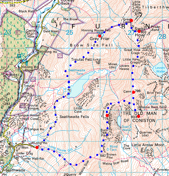 Route: Walna Scar Road, fell gate (Seathwaite) - Walna Scar Road - Brown Pike - Buck Pike - Dow Crag - Goat's Hause - Coniston Old Man - Brim Fell - Levers Hawse - Swirl How - Great Carrs - Fairfield - Grey Friar - Seathwaite Tarn - fell gate