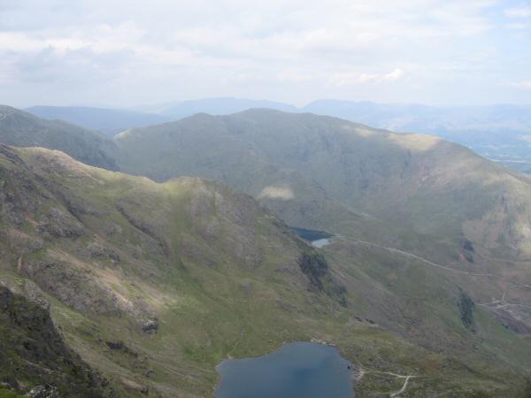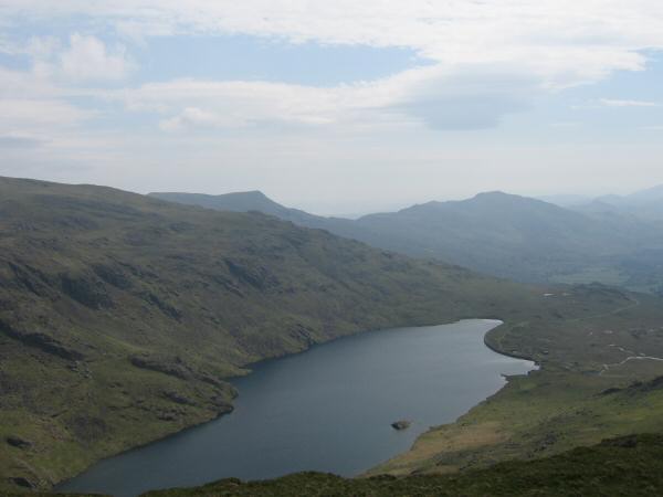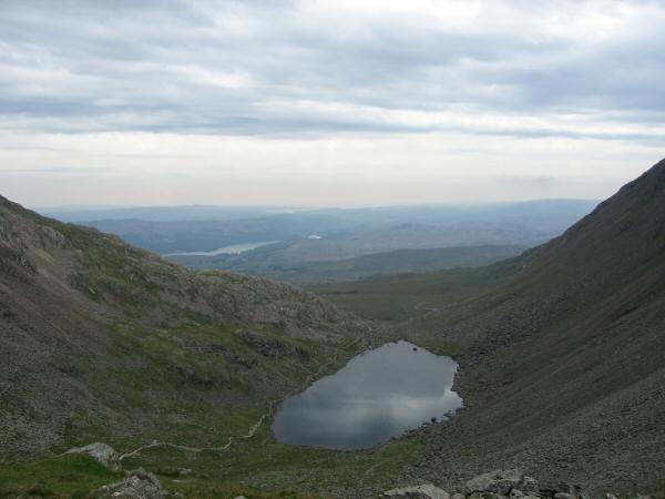 Wetherlam from Coniston Old Man with Low Water straight down and a glimpse of Levers Water