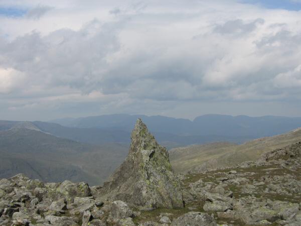 The 'Matterhorn Rock' on Grey Friar with the Helvellyn ridge and Fairfield in the distance