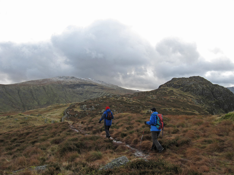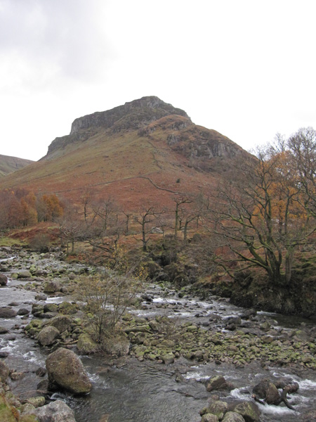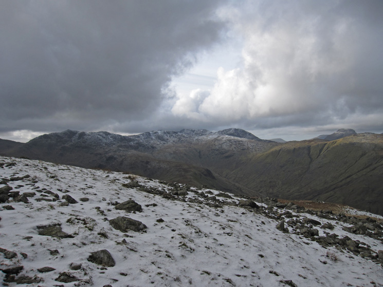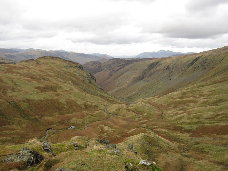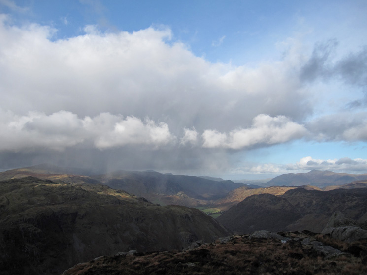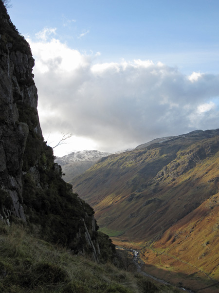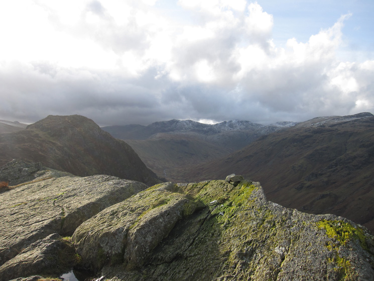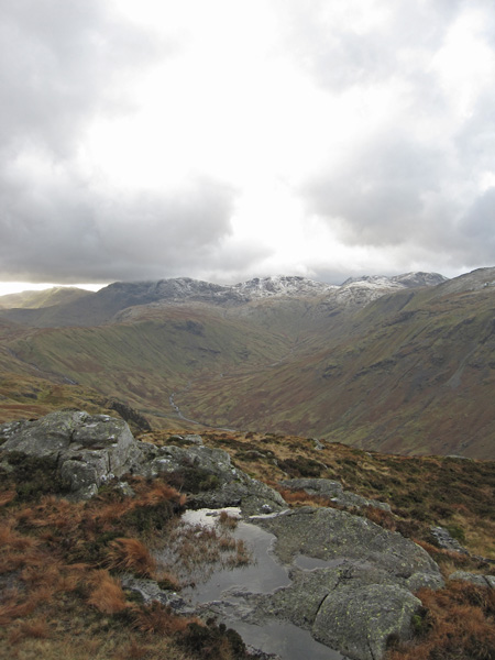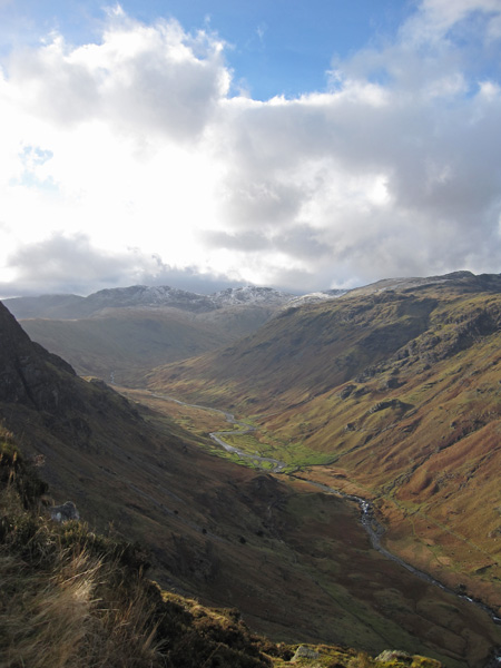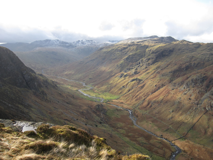 The flanks of Glaramara on the far side of Langstrath and a touch of snow on Esk Pike in the distance