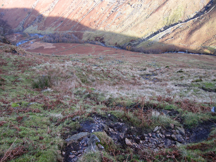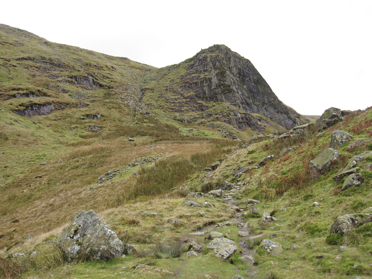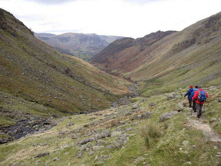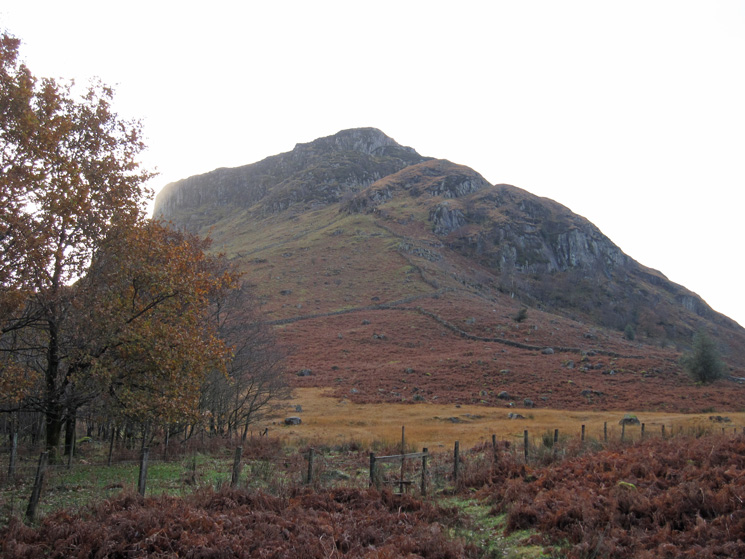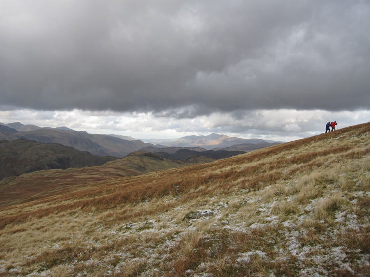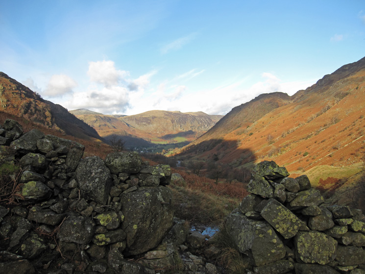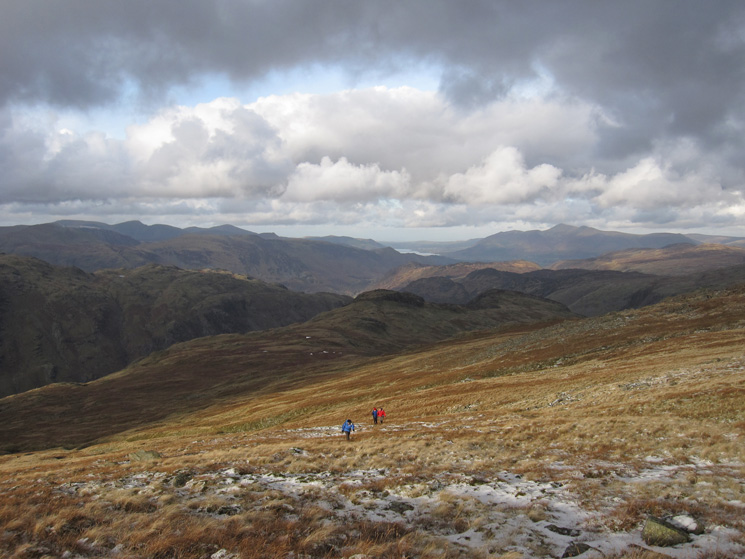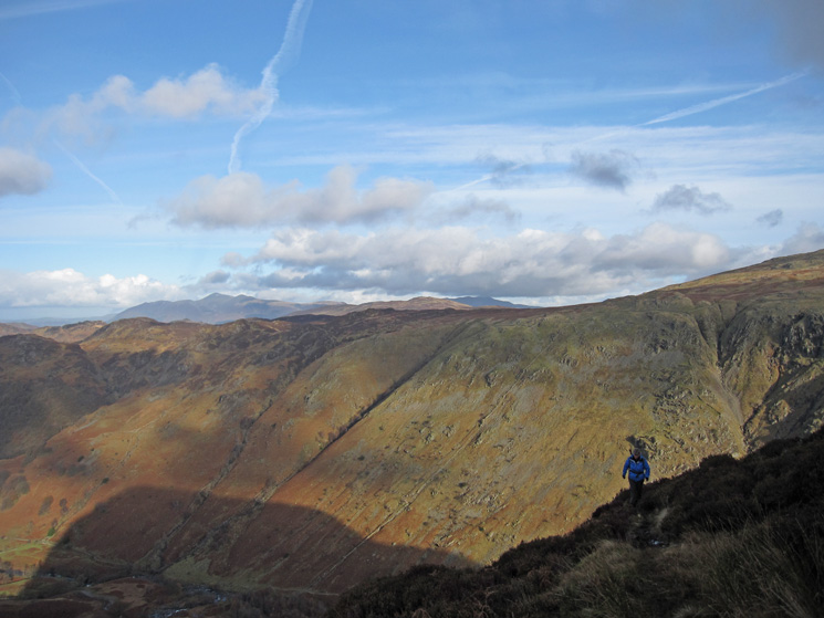 The flanks of Glaramara on the far side of Langstrath and a touch of snow on Esk Pike in the distance