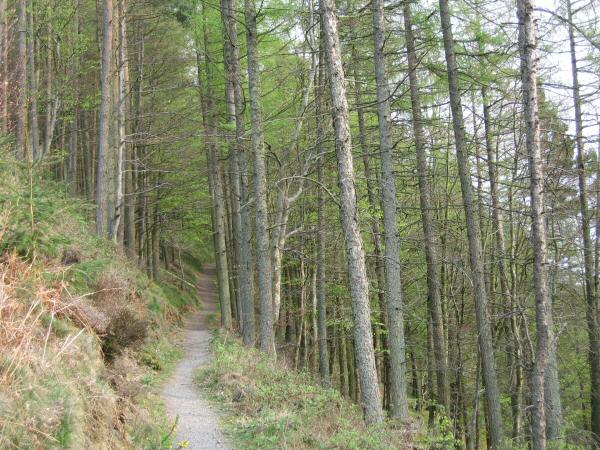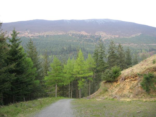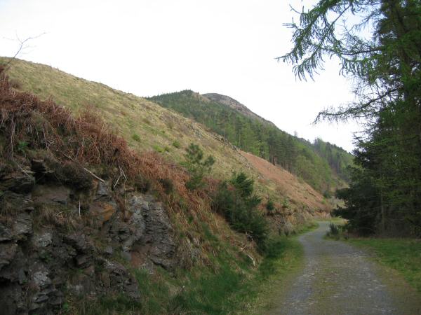 One of the forest tracks in Dodd Wood, Dodd's summit is hidden from view behind the high point on the skyline