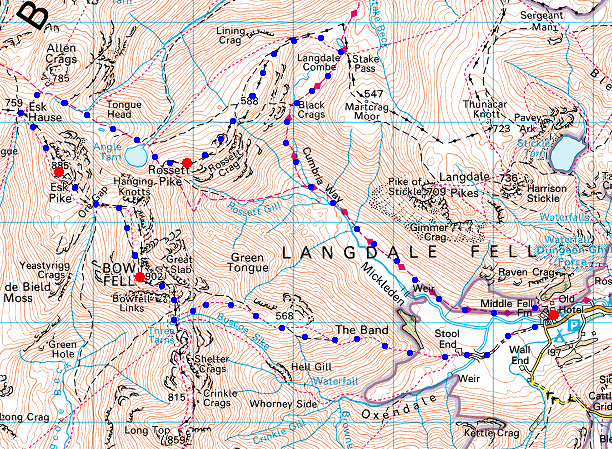 Route: Old Dungeon Ghyll Hotel, Great Langdale - Stool End Farm - The Band - Three Tarns - Bowfell - Ore Gap - Esk Pike - Esk Hause - Angle Tarn - Rossett Pike - Stake Pass - Mickleden - Old Dungeon Ghyll Hotel