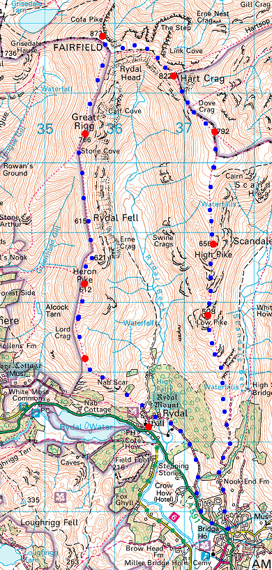 Route: Rydal - Nab Scar - Heron Pike - Erne Crag top - Great Rigg - Fairfield - Link Hause - Hart Crag - Dove Crag - High Pike - Low Pike - Low Sweden Bridge - Nook Lane - Ambleside - Rydal Park - Rydal