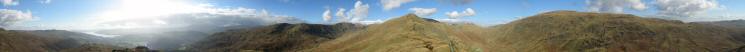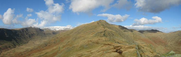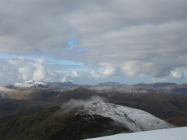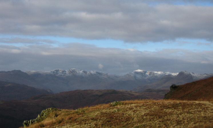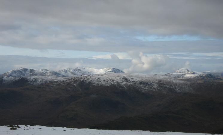 Looking west towards Bowfell, Esk Pike, the Scafells, Great End and Great Gable from Great Rigg