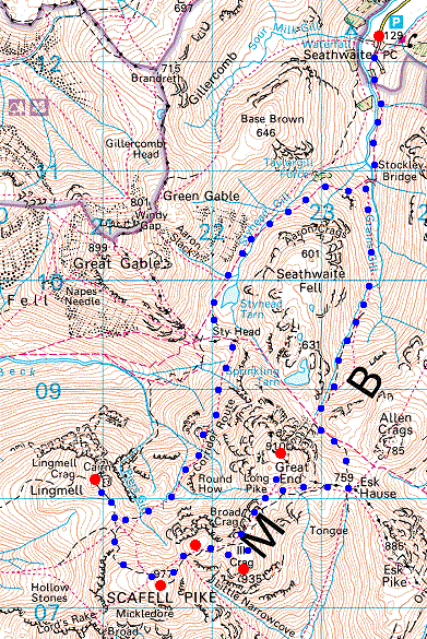 Route: Seathwaite, Borrowdale - Stockley Bridge - Grains Gill - Esk Hause - Great End - Ill Crag - Broad Crag - Scafell Pike - Lingmell - Corridor Route - Sty Head - Styhead Tarn - Styhead Gill - Stockley Bridge - Seathwaite