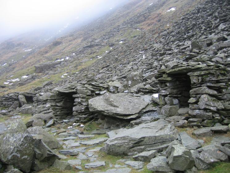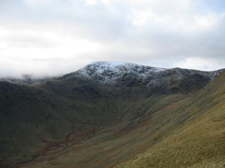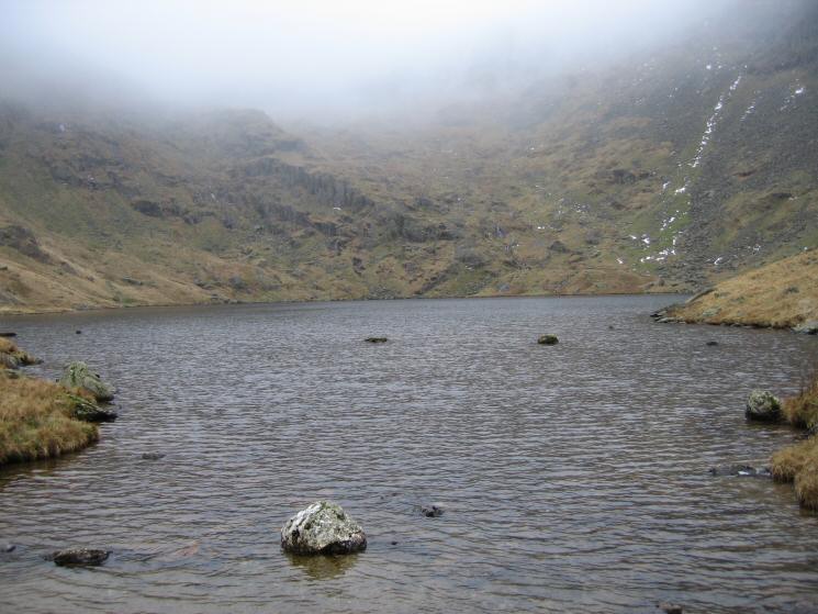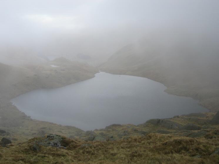 Small Water comes into view as we drop out of the cloud on the descent from Nan Bield Pass