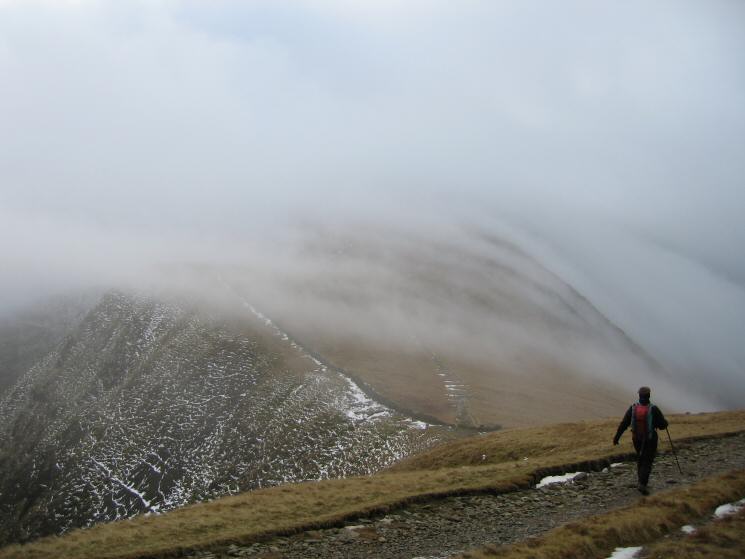 Cloud building to engulf the high fells. A bit of old snow on the ground high up.