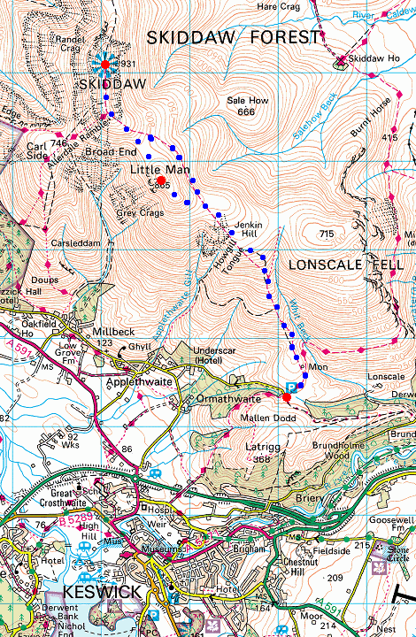 Route: Latrigg car park (end of Gale Road) - Jenkin Hill - Skiddaw Lesser Man - Skiddaw Little Man - Skiddaw - Jenkin Hill - Latrigg car park