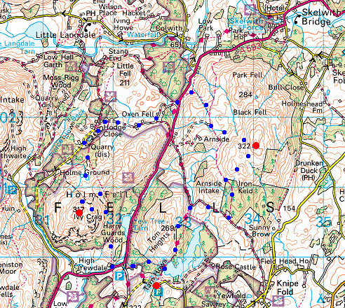 Route: Tarn Hows Carpark - Tarn Hows - Iron Keld Plantation - Black Fell (Black Crag) - Low Arnside - Hollin Bank - Tongue Intake - Low Oxen Fell - High Oxen Fell - Hodge Close - Holme Ground Tarns - Holme Fell - Ivy Crag - Uskdale Gap - Harry Guards Wood - Yew Tree Farm - Glen Mary Bridge - Tom Gill Waterfall - Tarn Hows - Tarn Hows Carpark