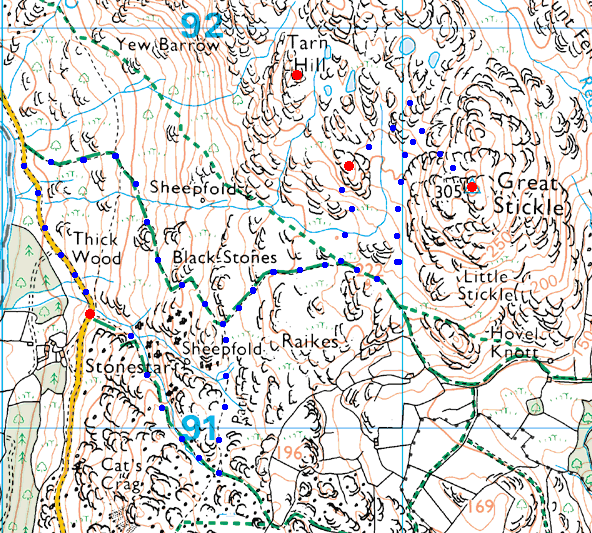 The plan was to follow A. Wainwright's 'Dunnerdale Fells' walk in his book 'The Outyling Fells of Lakeland' [page 132]. However we failed to visit Wainwright's top being distracted by a very prominent cairn on a top to the south east, we only discovered this on looking at the book on returning home. The red dot next to 'Tarn Hill' on the map marks the top we should have visited. To extend the walk we visited Great Stickle on our return to the car.