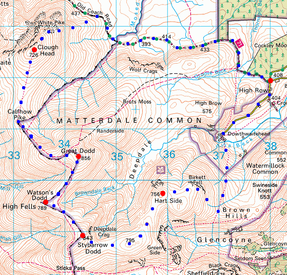 Route: High Row - Dowthwaitehead - Birkett Fell - Hart Side - White Stones (Green Side) - Stybarrow Dodd - Watson's Dodd - Great Dodd - Calfhow Pike - Clough Head - White Pike - Mariel Bridge - Old Coach Road - High Row