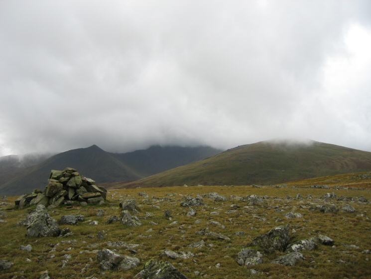 The pointed top of Catstycam, Helvellyn in cloud and Raise from White Stones (Green Side)