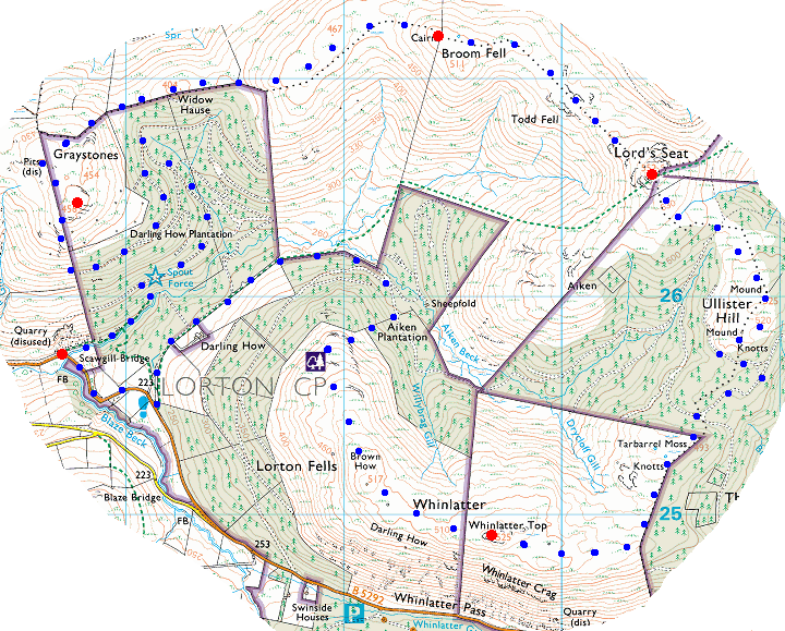 Route: Scawgill Bridge - Spout Force - Darling How Plantation - Graystones - Widow Hause - Broom Fell - Lord's Seat - Ullister Hill - Tarbarrel Moss - Whinlatter Top - Brown How - Aiken Plantation - Darling How - Spout Force car park - Scawgill Bridge
