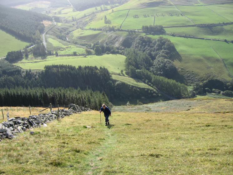 Looking back down the steep path to Graystones summit, Scawgill Bridge can just be made out middle right