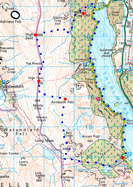 Route: Dobgill Bridge - Harrop Tarn - Bell Crags - Armboth Fell - High Tove - High Seat - Raven Crag - Thirlmere Dam End - Thirlmere - Armboth - Deergarth How Island - Launchy Gill - Hause Point - Dobgill Bridge