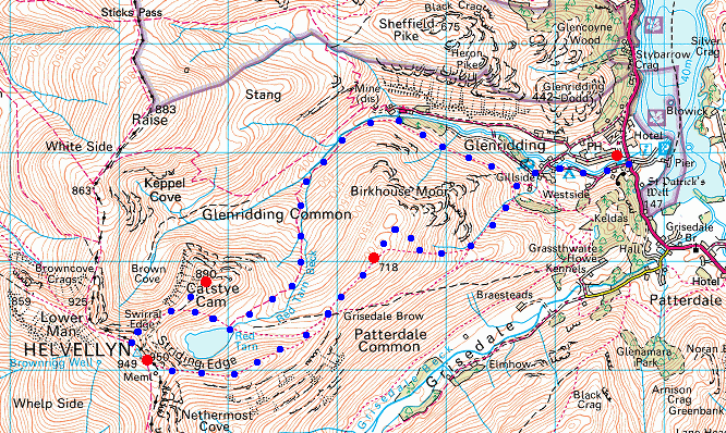 Route: Glenridding village - Mires Beck path - Birkhouse Moor - High Spying How - Striding Edge - Helvellyn - Swirral Edge - Catstycam - Red Tarn - Glenridding valley - Glenridding village