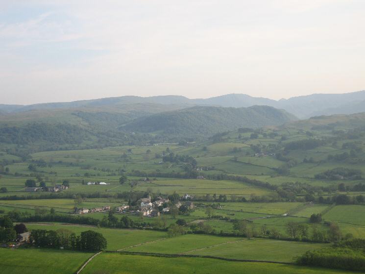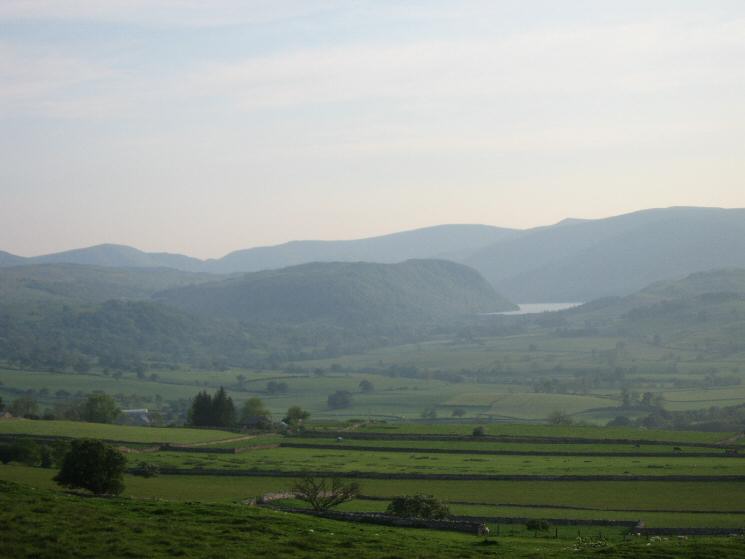 Looking over Bampton Grange to Naddle Forest with the High Street fells behind from Knipescar Common