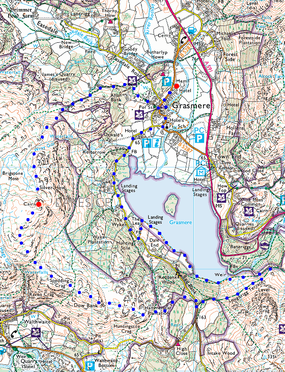 Route: Grasmere Village - Allan Bank - Wray Gill - Silver How - Dow Bank - Red Bank - Loughrigg Terrace - Grasmere - road - Grasmere Village