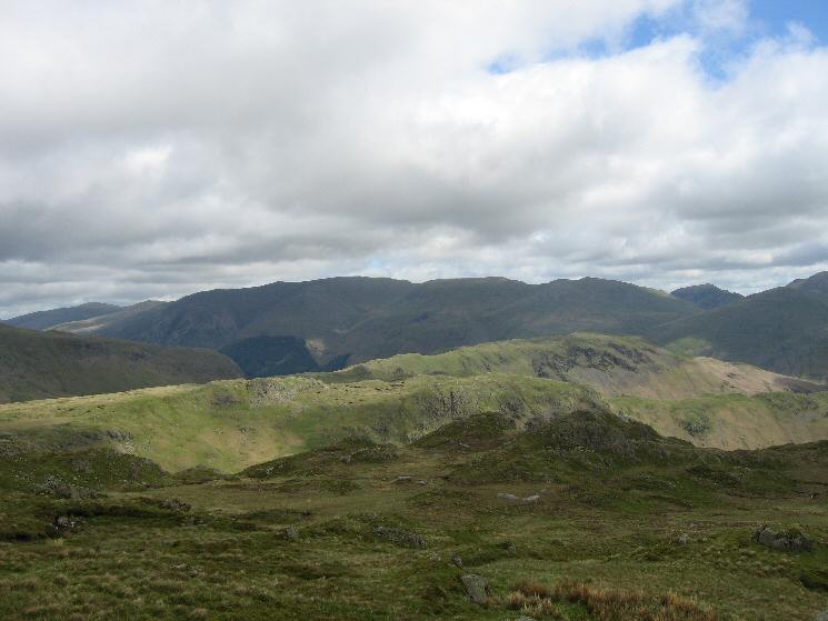 The Helvellyn fells, Saint Sunday Crag and the Fairfield fells on the skyline from Thunacar Knott