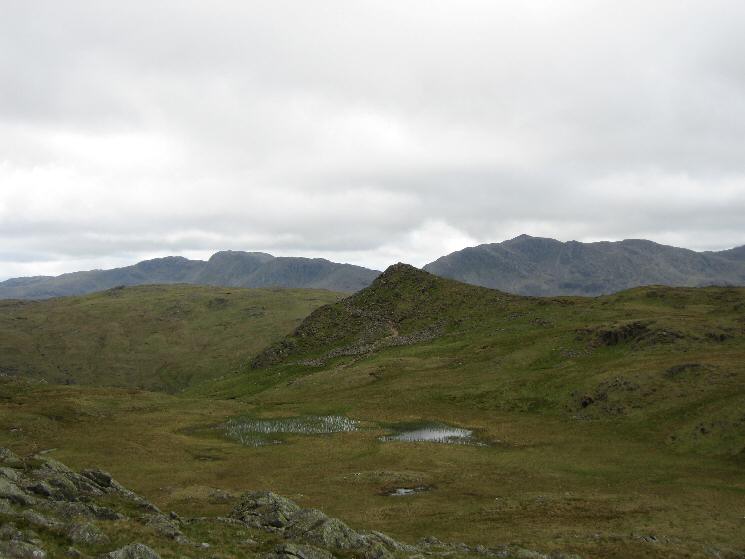 The Blea Rigg ridge (in shadow) and Codale Head on the far right with the Coniston Fells and Harrison Stickle behind from Tarn Crag