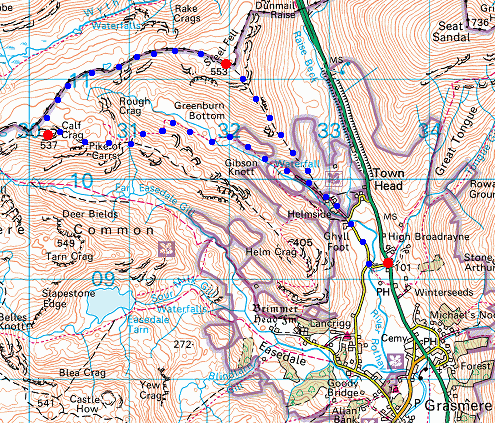 Route: Mill Bridge, Grasmere - Ghyll Foot - Greenburn valley - Greenburn Bottom - Pike of Carrs - Calf Crag - Steel Fell Tarn - Steel Fell - South East Ridge - Ghyll Foot - Mill Bridge