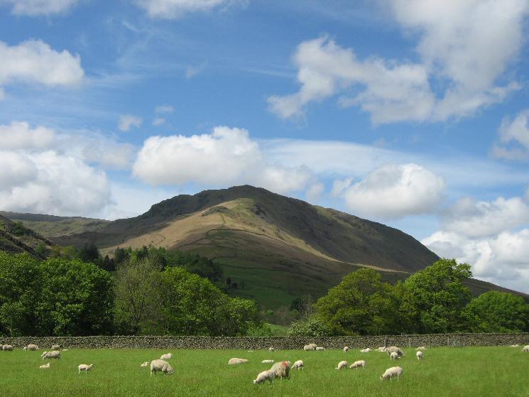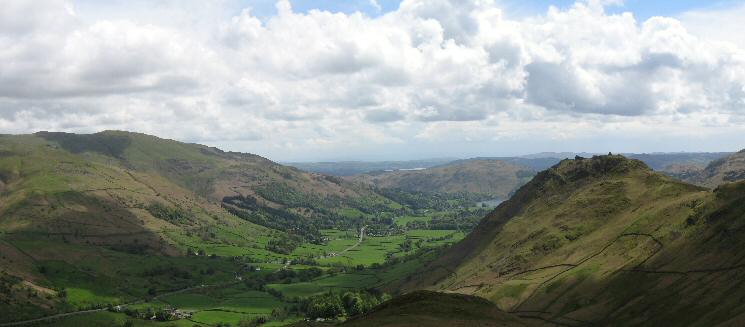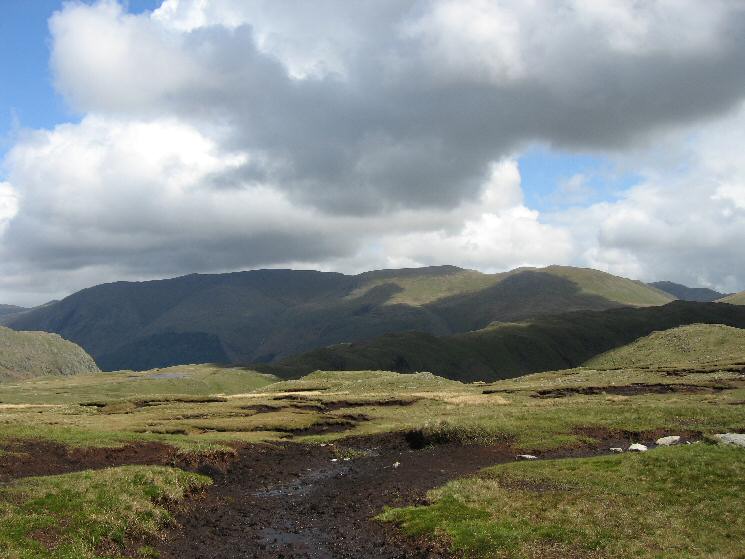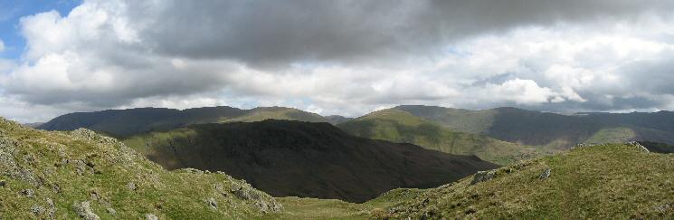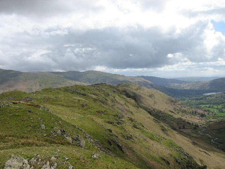 Steel Fell in shadow with the Helvellyn ridge, Seat Sandal and the Fairfield fells behind