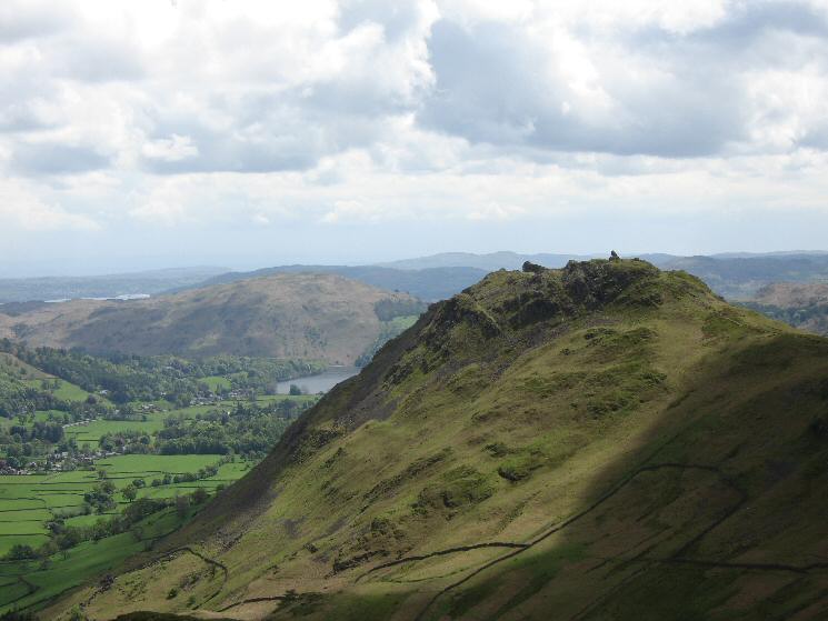 A glimpse of Grasmere with Loughrigg Fell beyond from the bottom of Steel Fell's south east ridge
