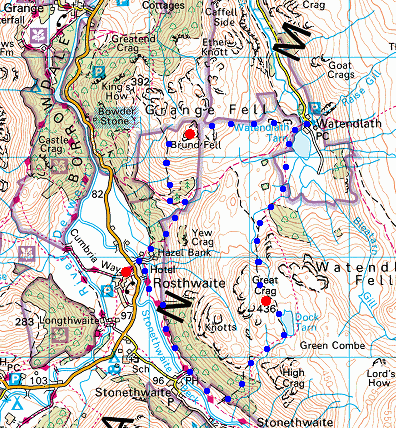 Route: Rosthwaite - Stonethwaite Beck - Lingy End - Dock Tarn - Great Crag - Watendlath Tarn - Watendlath - Grange Fell (Brund Fell) - Rosthwaite