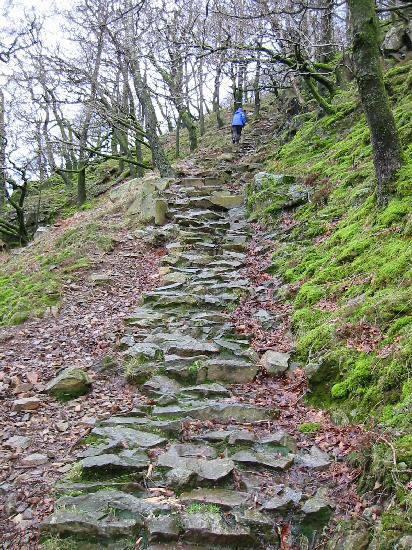 The steep pitched path up through the woods to Lingy End