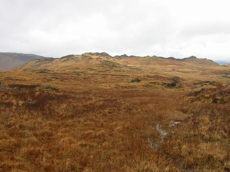 The view south back to Great Crag with Ullscarf on the left and High Raise in the distance