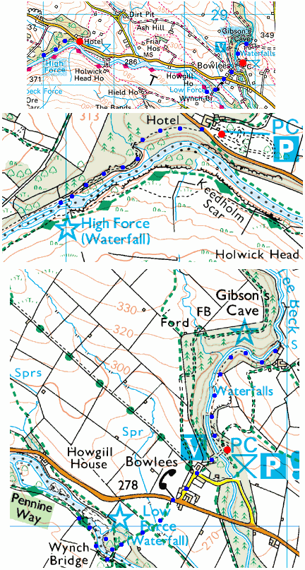 Route: High Force Hotel - High Force - High Force Hotel - B6277 (car journey 1.75 miles) - Bowlees - Low Force - Bowlees - Summerhill Force - Bowlees
