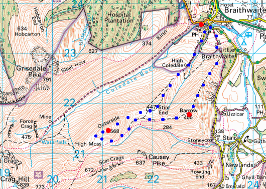 Route: Braithwaite - Braithwaite Lodge - Barrow - Barrow Door - Stonycroft Gill miner's track - Outerside - Stile End - High Coledale - Braithwaite