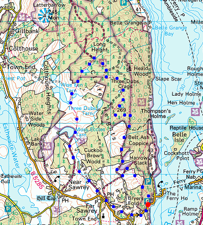 Route: Ash Landing (Windermere Ferry) - Far Sawrey - Moss Eccles Tarn - Wise Een Tarn - Highs Moss - Claife Heights (High Blind How) - High Pate Crag - Low Pate Crag - Claife Station - Windermere - Ash Landing