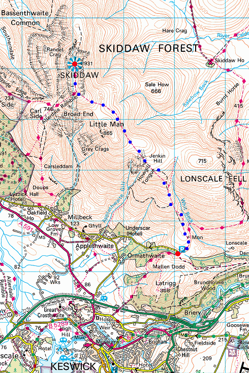 Route: Latrigg car park (end of Gale Road) - Jenkin Hill - Skiddaw - Jenkin Hill - Latrigg car park