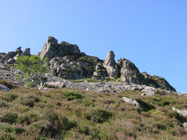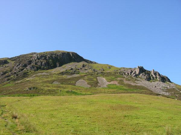 Looking up to Revelin Crag and the Crag Fell pinnacles from the col