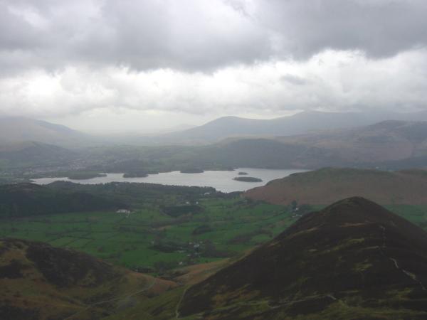 Looking over Barrow to the Skiddaw Fells from the climb up Causey Pike with Bassenthwaite Lake on the left