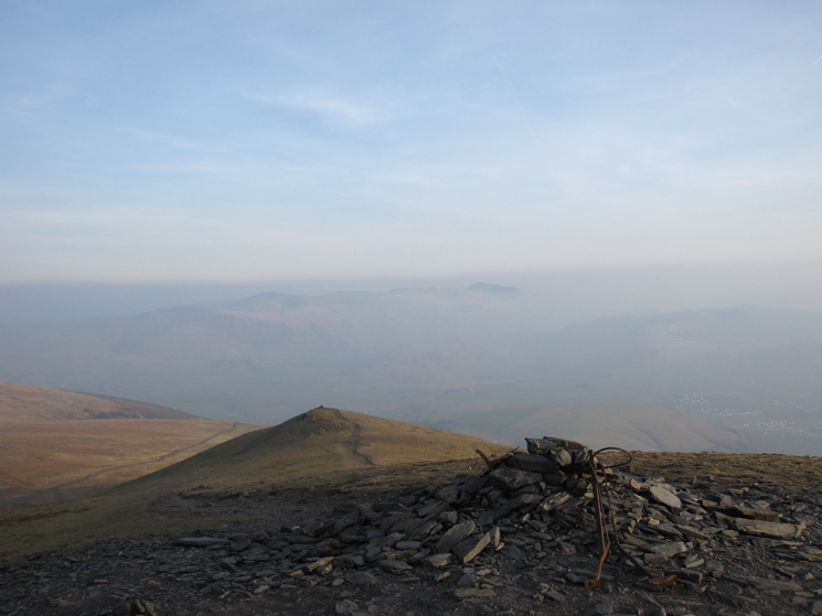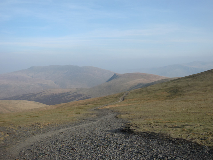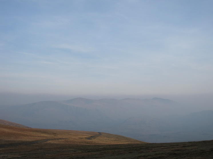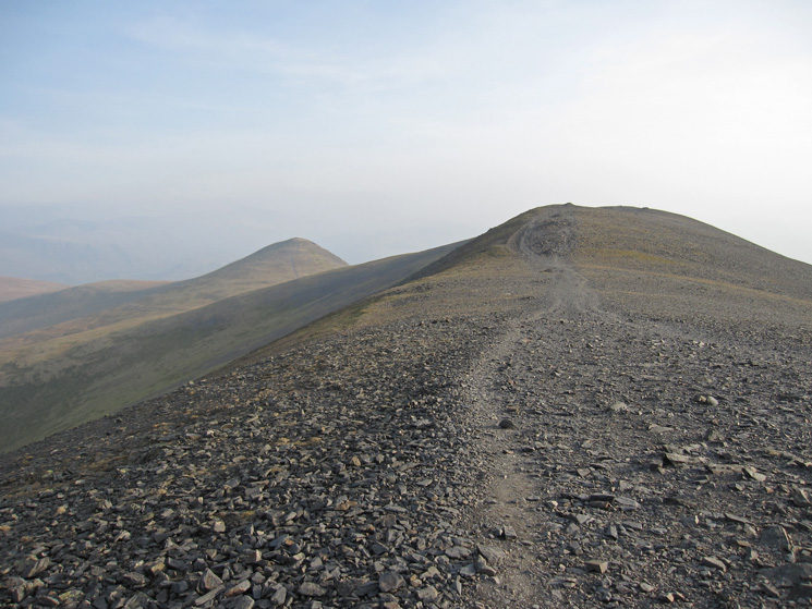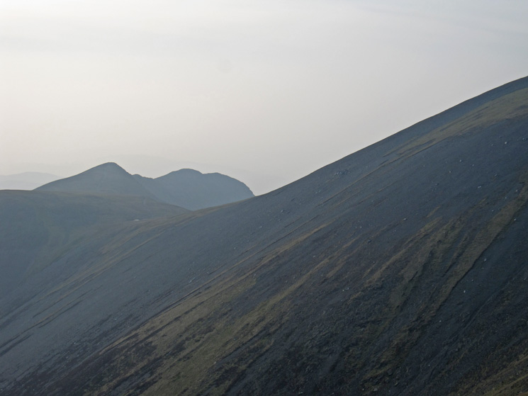 Skiddaw Little Man with Lesser Man in front. The Helvellyn range can just be made out through the haze