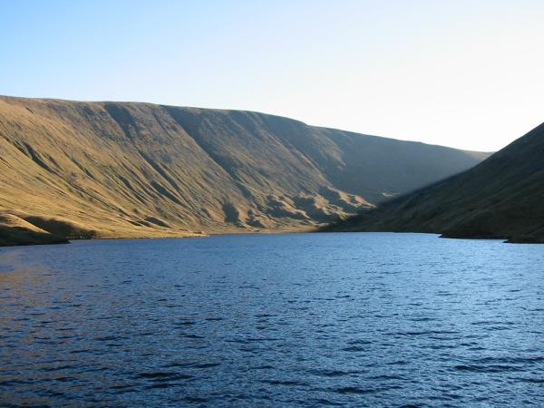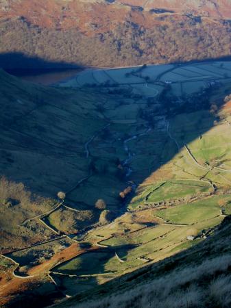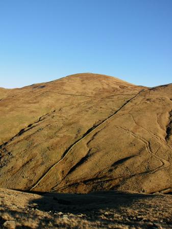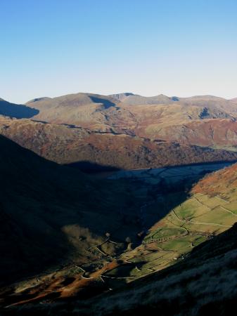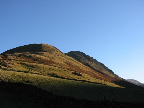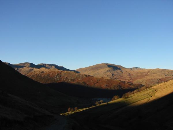 Gray Crag's west face catching the sun from the track back to Hartsop