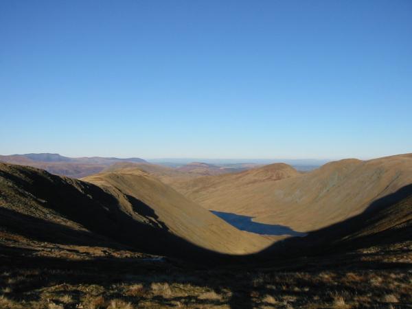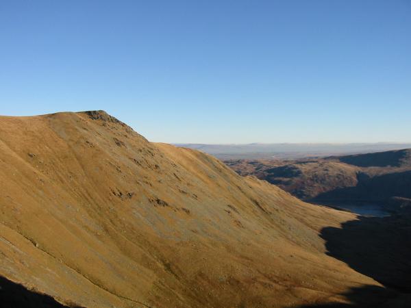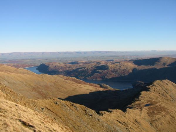 Long Stile leading down to Rough Crag, Haweswater and The Pennines in the distance