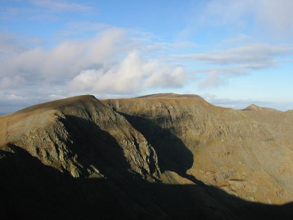 High Crag, the flat top of Nethermost Pike with Helvellyn behind and the pointed top of Catstycam from Dollywaggon Pike