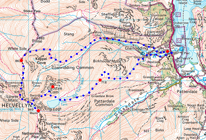 Route: Glenridding village - Mires Beck path - Birkhouse Moor - Hole-in-the-Wall - Red Tarn - Catstycam - Swirral Edge - Helvellyn - Helvellyn Lower Man - White Side - Glenridding (Greenside Road) - Glenridding village
