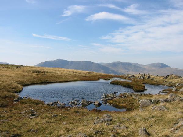 Bowfell, Esk Pike and Great End from the tarn on Thunacar Knott