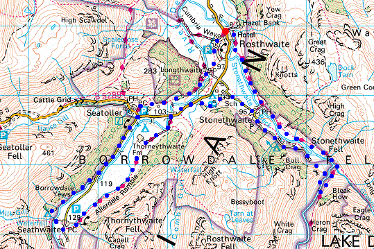 Route: Rosthwaite - Stonethwaite Bridge - Smithymire Island - Johnny House - Stonethwaite - Mountain View cottages - Seathwaite - Seatoller - Longthwaite - Rosthwaite