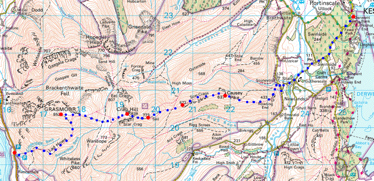 Route: Cinderdale Common - Lad Hows ridge - Grasmoor - Eel Crag (Crag Hill) - Sail - Sail Pass - Scar Crags - Causey Pike - Rowling End - Stonycroft near Stair - Stair - Swinside - Derwent Bank
