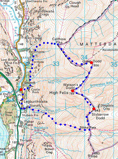 Route: Legburthwaite - above Fornside - Beckthorns Rib - Calfhow Pike - Great Dodd - Watson's Dodd - Stybarrow Dodd - Sticks Pass - Stanah - Legburthwaite