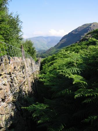 The route follows the wall to the trees and then the fell side is climbed by the old peat track