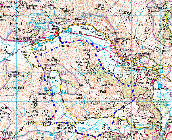 Route: Stickle Barn, Great Langdale - Side House - Blea Tarn - Fell Foot - Little Langdale - Slater Bridge - Dale End - Baysbrown - Side House - Stickle Barn