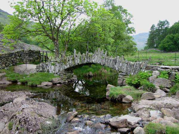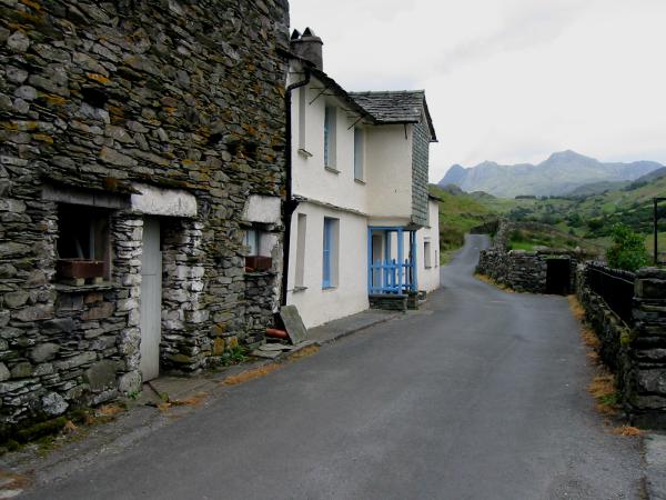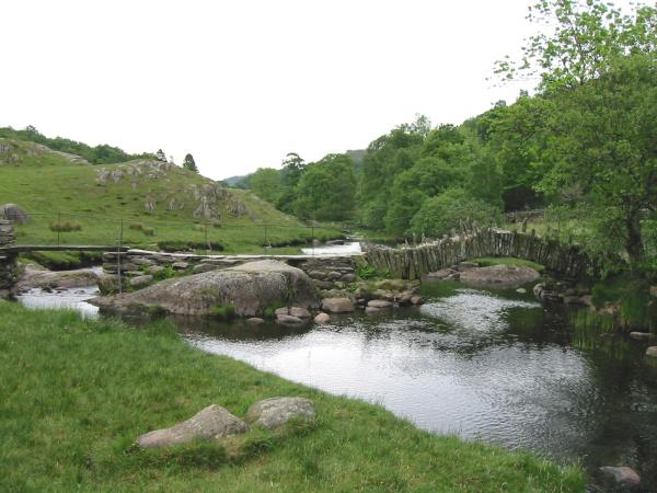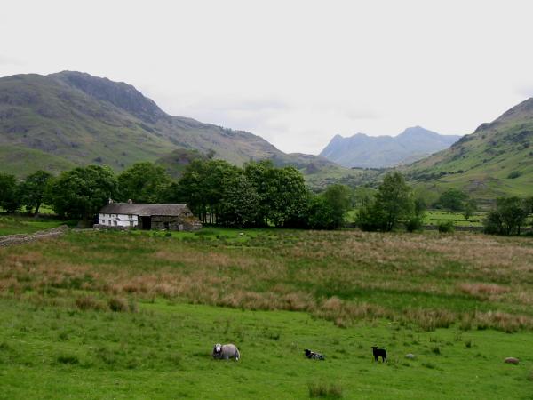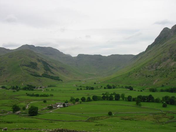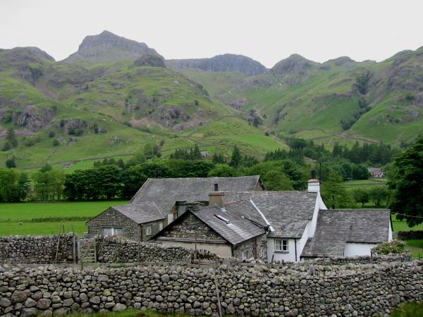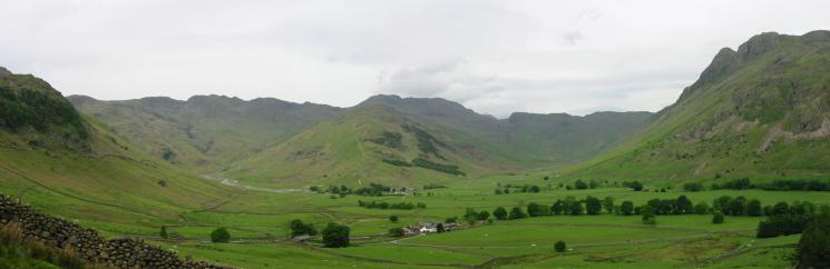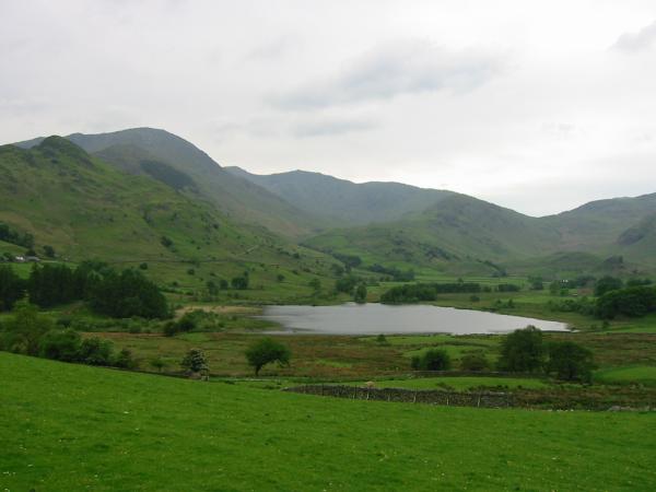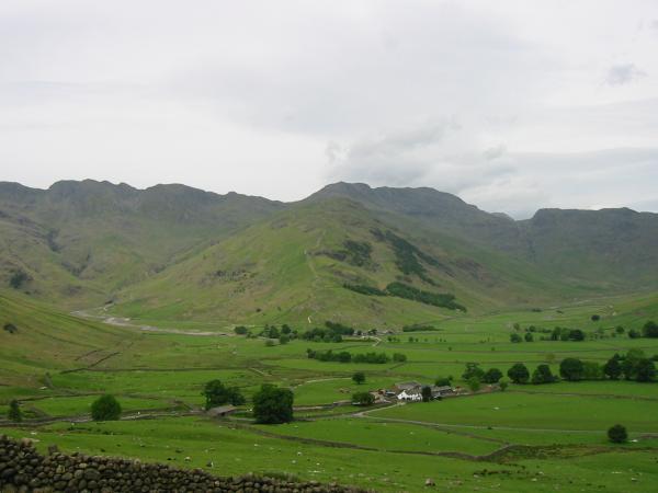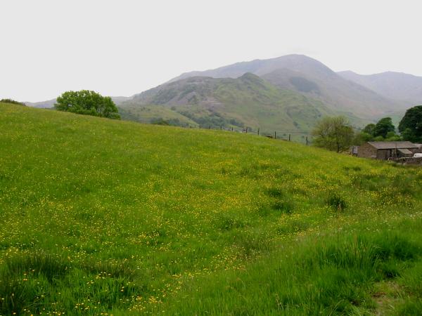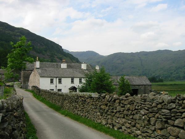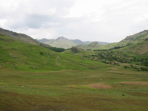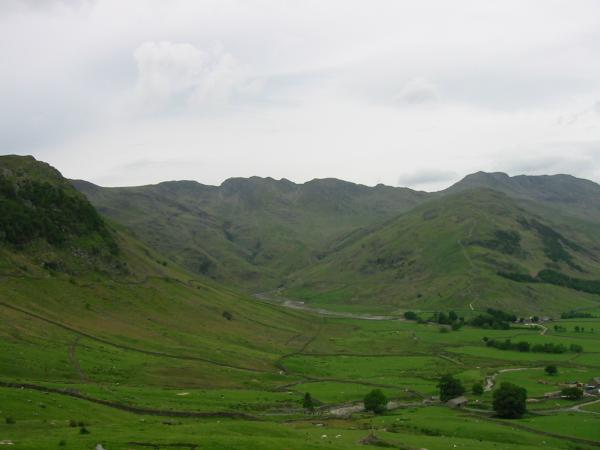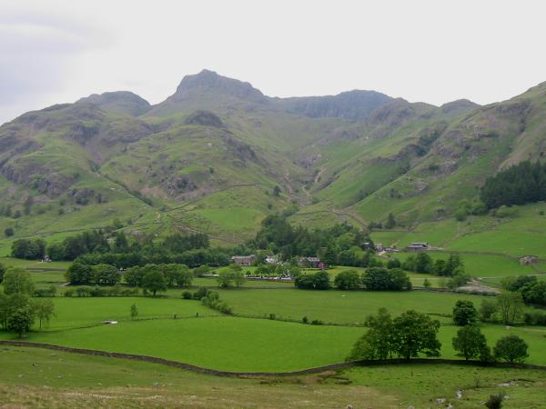 Bridge End with Blake Rigg behind on the left and the Langdale Pikes in the distance